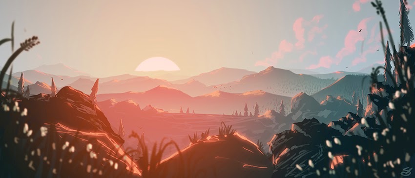 I've been out of the house early enough to see the sun rise a few times recently and while this isn't an interpretation of any particular location, its a refreshing site to see the valleys still cool with dew and mist as summer comes crawling our way.