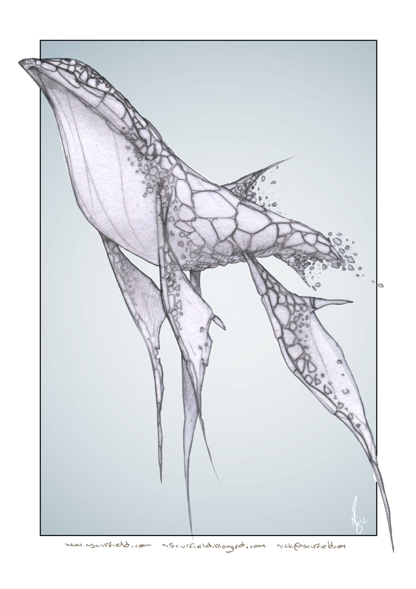 I wanted to do a sea-monster that delivered something other than a plesiosaur or the old legendary sea serpents. Playing with scale is a reliable way of delivering something that is both familiar yet fresh, so taking elements from frogs, turtles and Siamese fighting fish and then scaling them up (a lot) resulted in something i was really happy with.